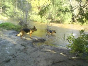 Sometimes we go to the beach at Strand. Here it can be more challenging for my big, energetic girls (GSDs) who cover so much ground quickly as the space is narrower with fewer options for changing direction and avoiding a possible problem. I am so proud of them when they meet and greet and politely choose not to respond to silly little yappers, or jumpy youngsters. They keep an eye on me and all I need to do is keep moving and maybe quietly call them away to have them break away and come after me. Shepherd bitches are not known for their patience so I am aware of their tolerance limits. Uschi usually chooses to not engage, but if she does she’s polite and disinterested. If she’s carrying a toy she’ll warn with a growl but never anything more. She’s a balanced dog with a happy temperament. Her daughter Minka is more reactive and much more interested in interacting with other dogs, but not keen on playing anymore. If a game starts I have to watch her that she doesn’t switch from ‘play’ to ‘prey’. Rather bossy, in typical insecure child fashion.